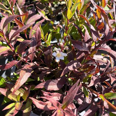 Deutzia gracilis ‘Nikko’. Slender Deutzia. Dense, rounded, deciduous shrub with slender, broadly spreading to arching stems. Smothered in tiny, fragrant white blooms in spring. Foliage turns rich burgundy in autumn. Moist, well drained soil in full sun. Trim after flowering. Hardy. Deciduous. 60 cm x 1.5m