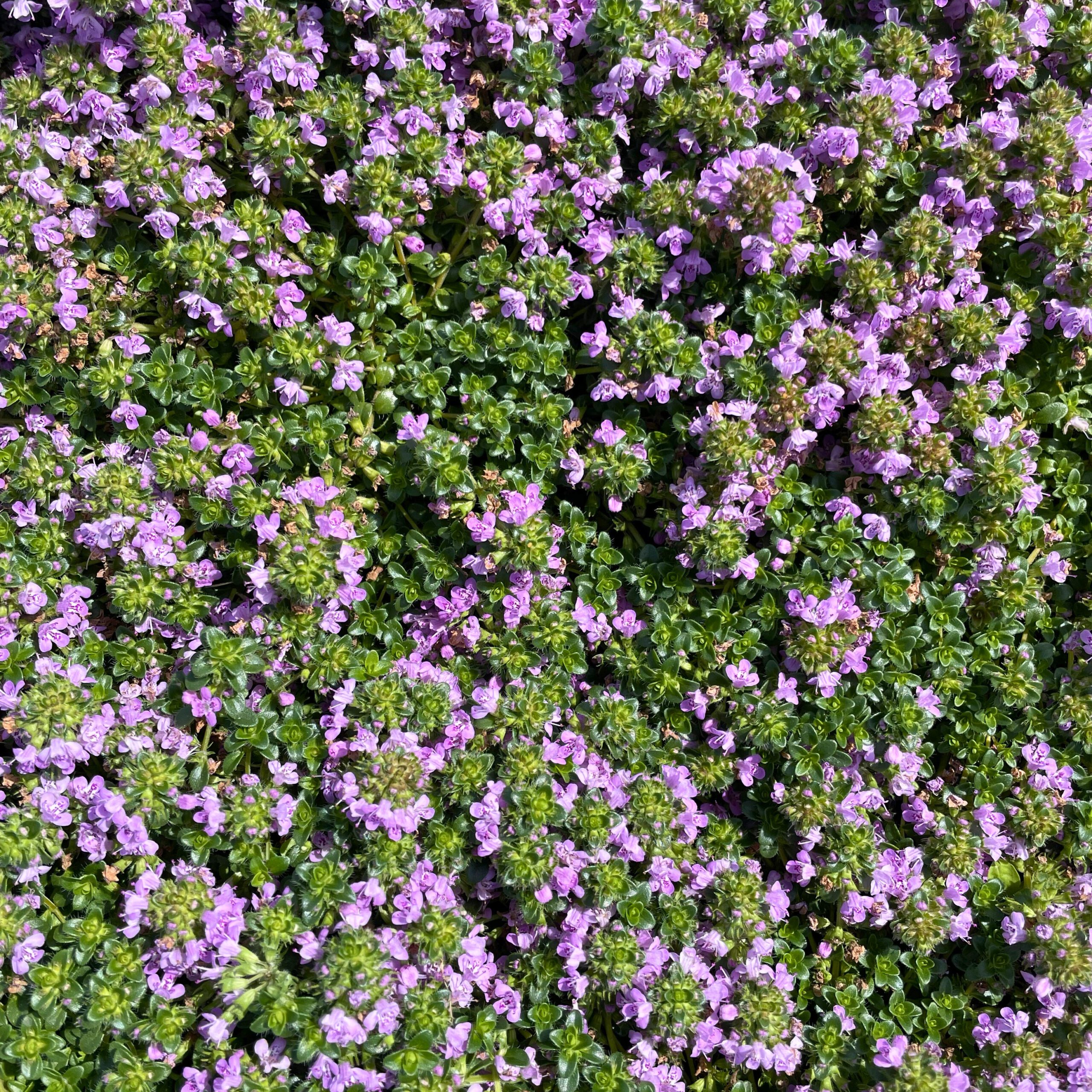 Lavender thyme. Carpeting Thyme. Low-growing thyme with very sturdy little leaves and stems. Strong thyme scent with a hint of lavender. Hardy. Sun. Evergreen. 10 cm x 50 cm.