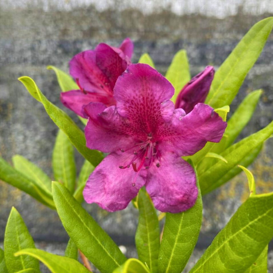 Rhododendron ‘Black Sport’ . Deep magenta flowers with an almost black eye. The deepness of the colour gives the flowers a rich, silky appearance. Very popular with purple fans. Lovely deep green foliage. 1.5m x 1.5m